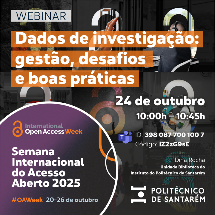Integrando as atividades da semana do Acesso Aberto, no próximo dia 24 de outubro, das 10h às 10,45h, decorrerá o webinar “ Dados de Investigação: gestão, desafios e boas práticas, promovido pela Unidade Biblioteca do IPSantarém.