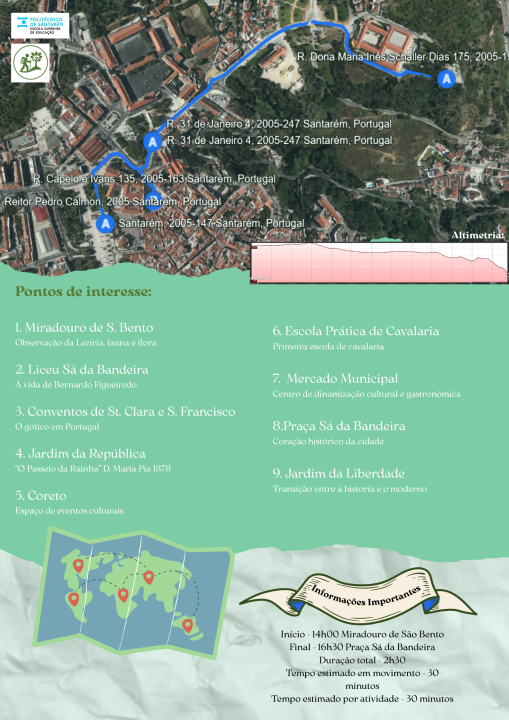 O Roteiro “Entre o Tejo e a Terra” inicia às 14h no Miradouro de São Bento e termina às 16h30 na Praça Sá da Bandeira, passando pelo Jardim da República e Jardim da Liberdade.