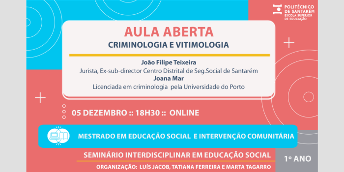 A Escola Superior de Educação do Politécnico de Santarém promove Aula Aberta no âmbito do Mestrado em Educação Social e Intervenção Comunitária com a temática “Criminologia e Vitimologia”, com a participação de João Filipe Teixeira, jurista, ex-sub-director do Centro Distrital de Segurança Social de Santarém e Joana Mar, licenciada em criminologia pela Universidade do Porto.