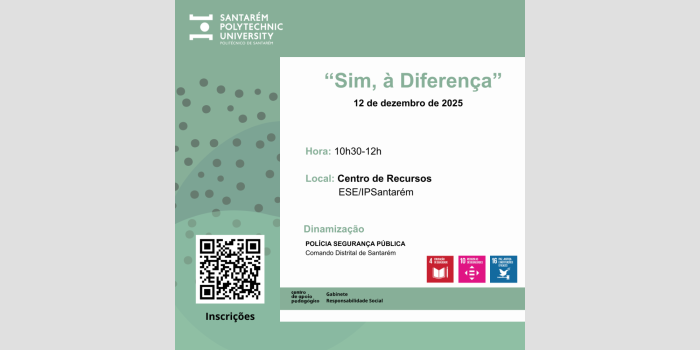 No próximo dia 12 de dezembro de 2026, numa parceria entre o Centro de Apoio Pedagógico da ESES e o Gabinete de Responsabilidade Social do Politécnico de Santarém, irá realizar-se uma sessão dinamizada pela PSP – Comando Distrital de Santarém, uma sessão com o título: “Sim, à diferença”.