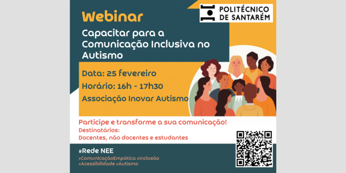 A Rede NEE do Politécnico de Santarém promove a sessão “Capacitar para a Comunicação Inclusiva no Autismo”, dedicada à sensibilização e capacitação da comunidade académica para uma comunicação mais ajustada, ética e facilitadora da inclusão.