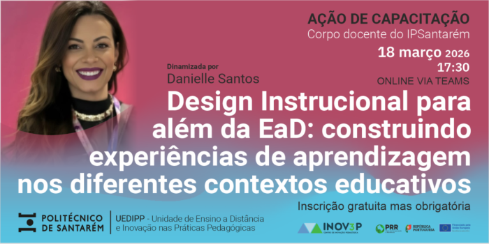 No próximo dia 18 de março de 2026, com início às 17h30, realiza-se a ação de capacitação “Design Instrucional para além da EaD: construindo experiências de aprendizagem nos diferentes contextos educativos”, destinada ao corpo docente do IPSantarém.