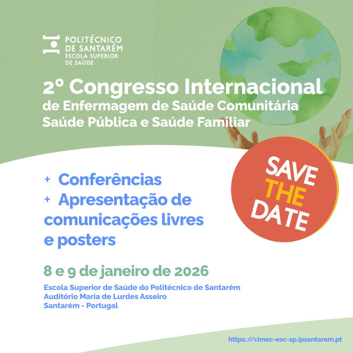 A Escola Superior de Saúde do Instituto Politécnico de Santarém vai organizar o II Congresso Internacional de Enfermagem de Saúde Comunitária que terá lugar nos dias 8 e 9 de janeiro de 2026. Este evento é a concretização da contribuição para o desenvolvimento da Enfermagem de saúde Comunitária tanto na área de Saúde Pública como na área de Saúde Familiar. Será um evento com convidados proeminentes na área a nível nacional e internacional.